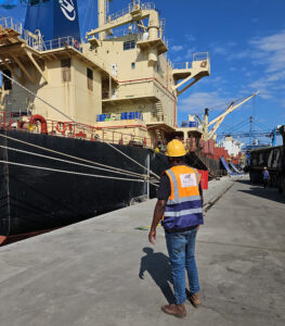 KAJOTE also monitored shore-side discharge activities, ensuring smooth coordination between vessel cranes, grab operations, and receiving transport units. Attention was given to housekeeping, spillage control, and safe working practices, reinforcing operational efficiency and environmental responsibility.