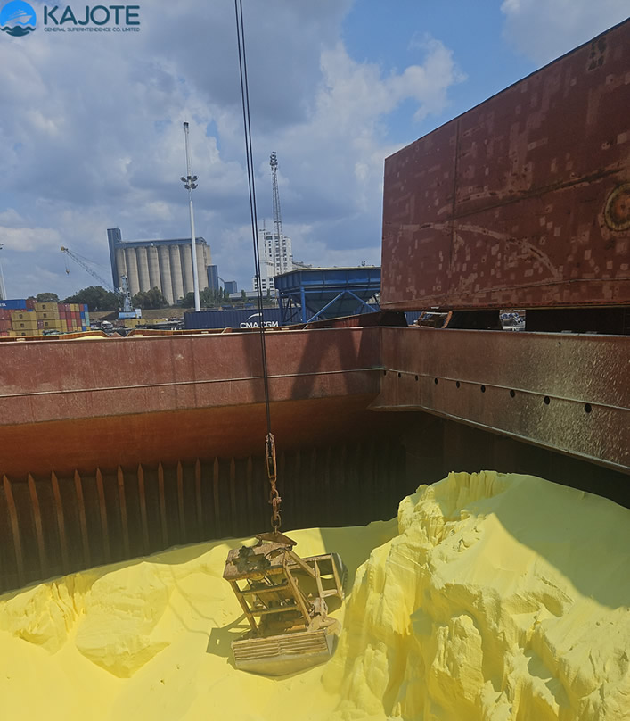 KAJOTE General Superintendence Co. Ltd successfully carried out discharging supervision and draft survey inspection for MV. YOUNG GLORY, which called at Dar es Salaam Port (DP World – Temeke Terminal) to discharge granular sulphur in bulk.